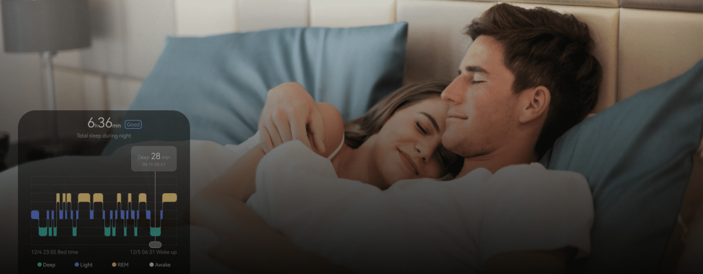 夜间睡眠全程监控,睡眠期心率、血氧、心率变异性、体温、姿态等多参数综合分析,提供睡眠质量评估和睡眠后的身体状况恢复报告, 关注睡眠状况下的健康问题,带来整晚的呵护